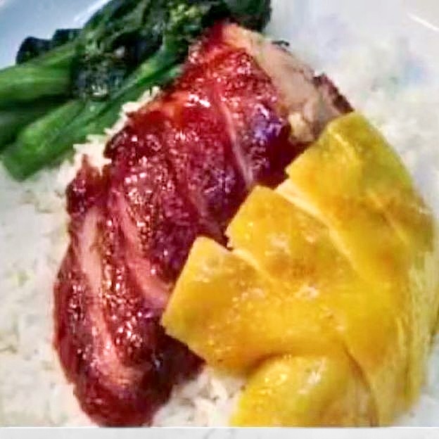 Sliced roast duck and roasted pork served over a bed of rice, offering a duo of classic flavors.