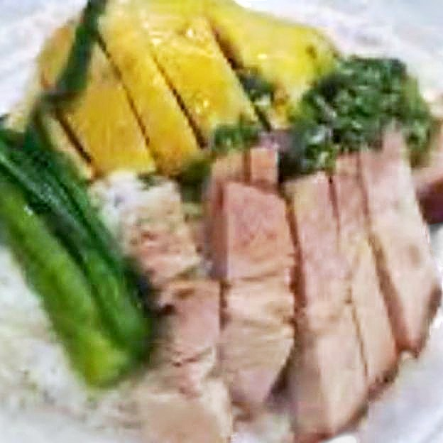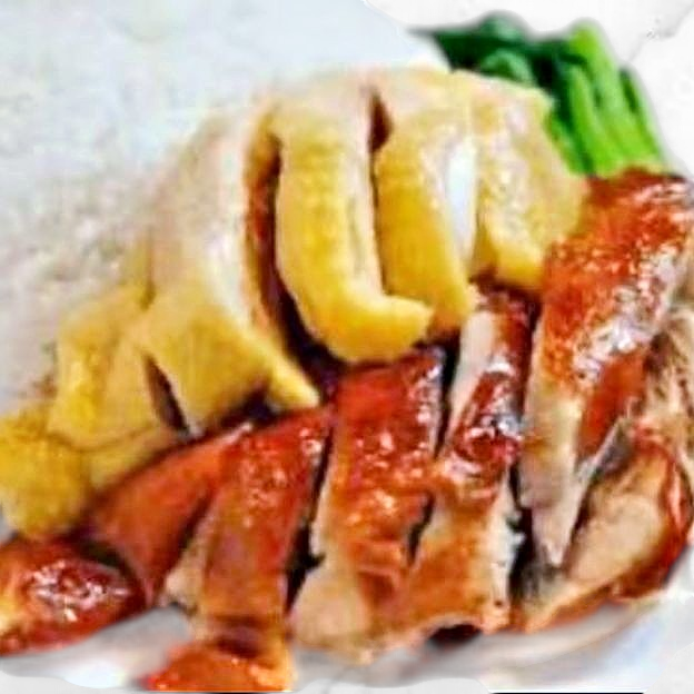 Sliced chicken and barbecued pork served with a side of steamed rice and garnished with green vegetables.