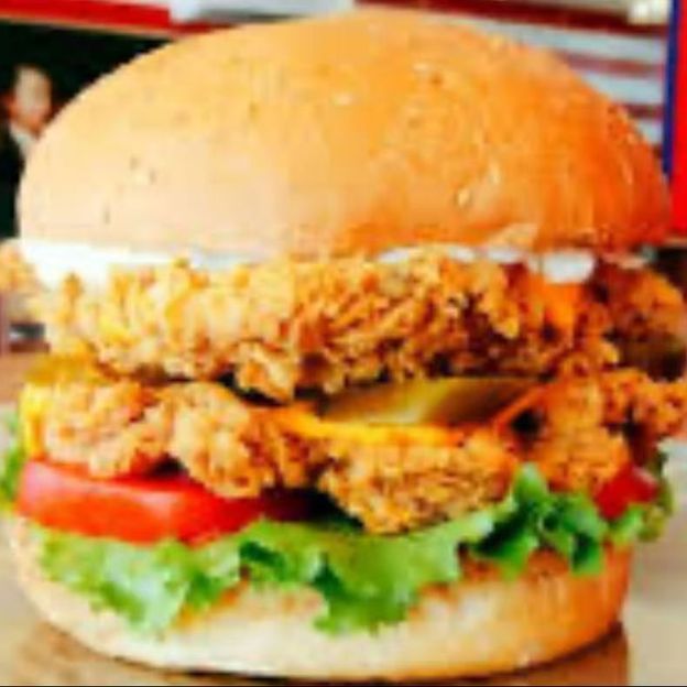 Double crispy chicken cheese lettuce tomato pickle w. CB sauce.
