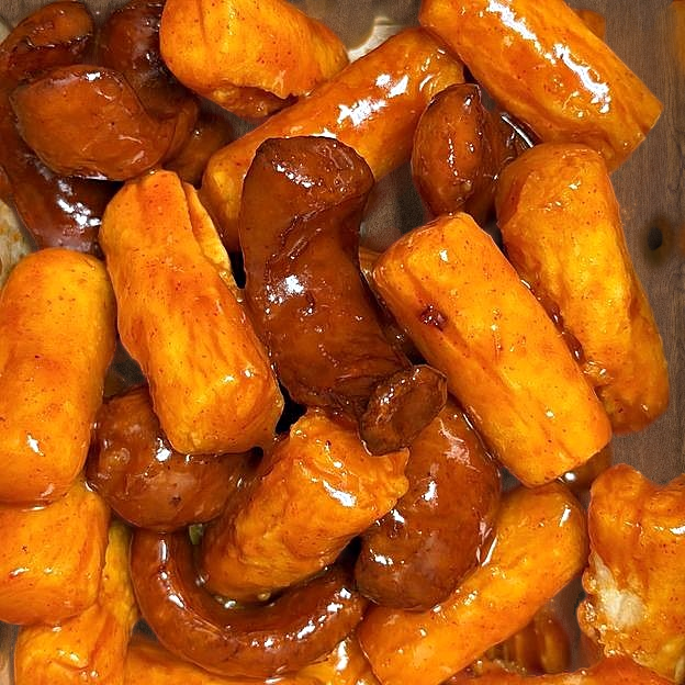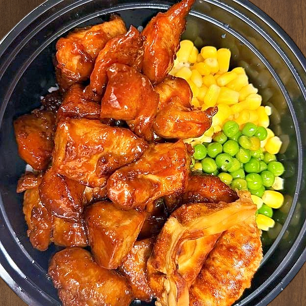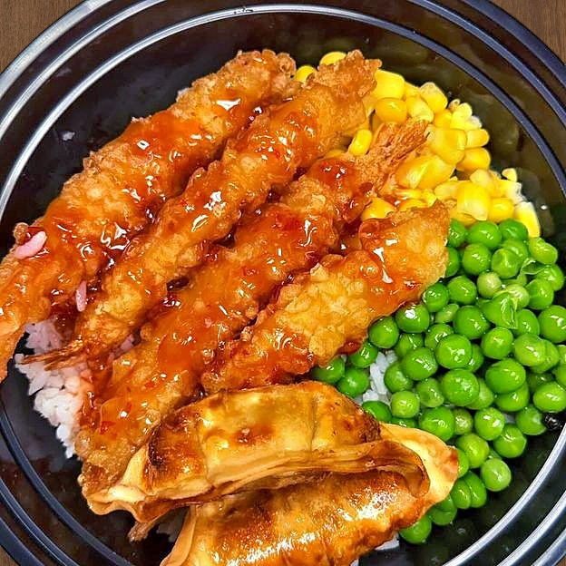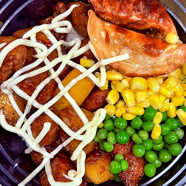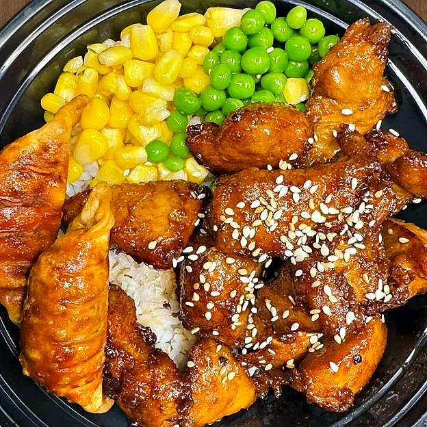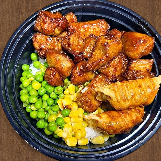 honey bbq chicken rice bowl with 2 pcs fried chicken dumplings