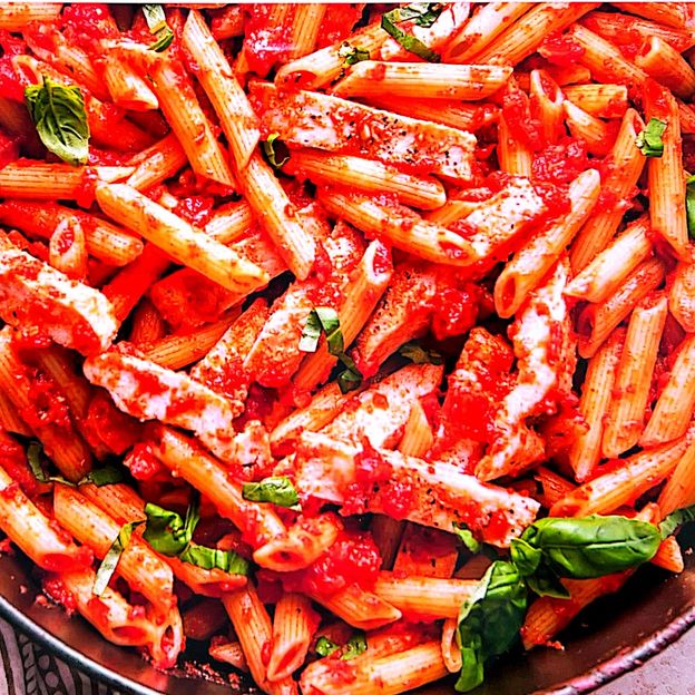 Penne pasta, red onions, green peppers, mushrooms, marinara sauce and pepperoni.