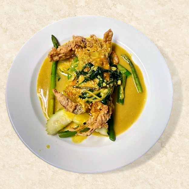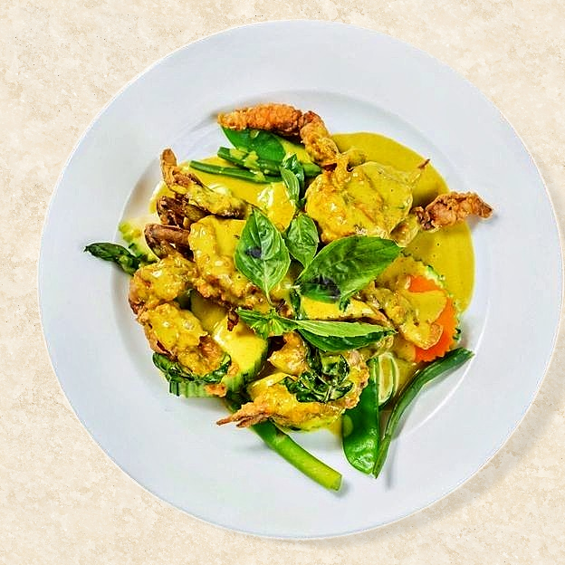Lightly battered, soft shell crab on top of asparagus, zucchini, carrots, snow peas, green