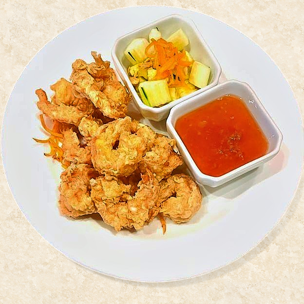 Fried jumbo shrimp w. cucumber salad and sweet chili sauce.