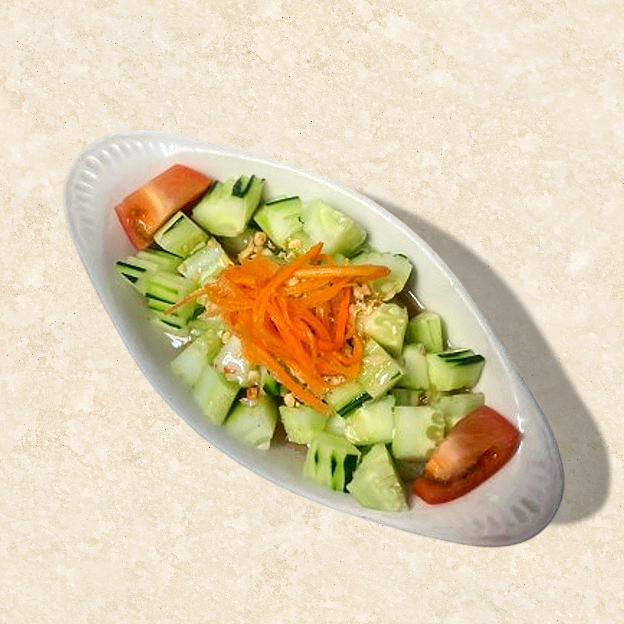 Fresh cucumbers and tomato w. thai vinaigrette dressing topped w. ground peanuts and shredded carrots.