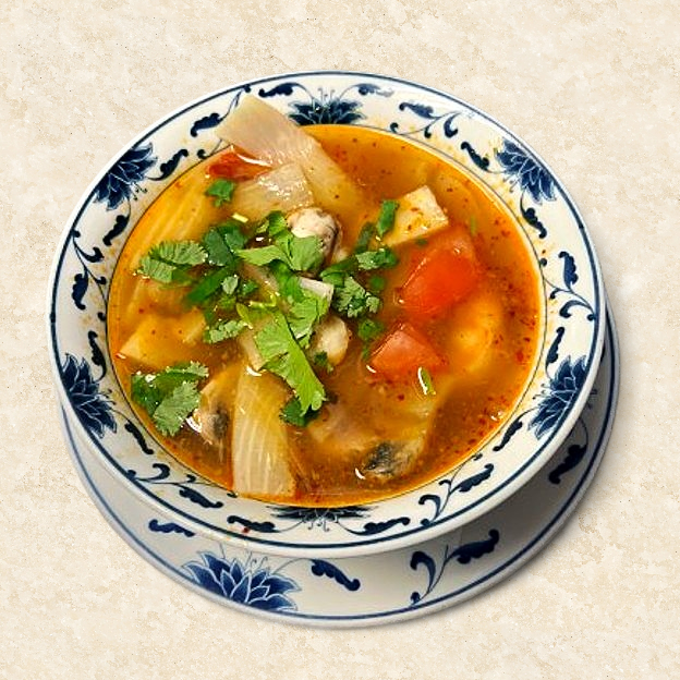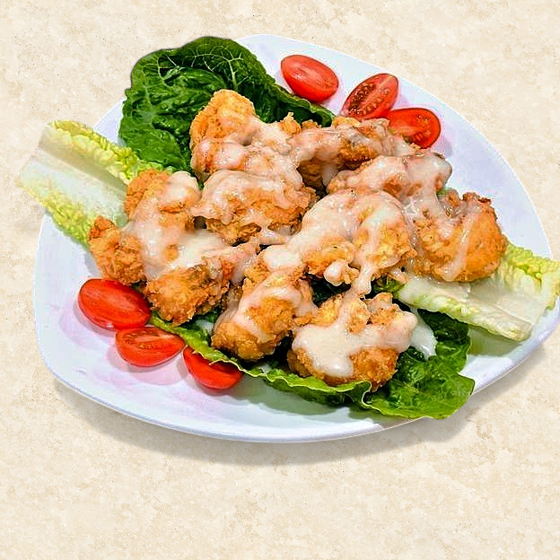 Fresh Green Salad Topped w. shredded carrots, red onions, cucumbers, tomatoes w. a Special Peanut Sauce on the side.
