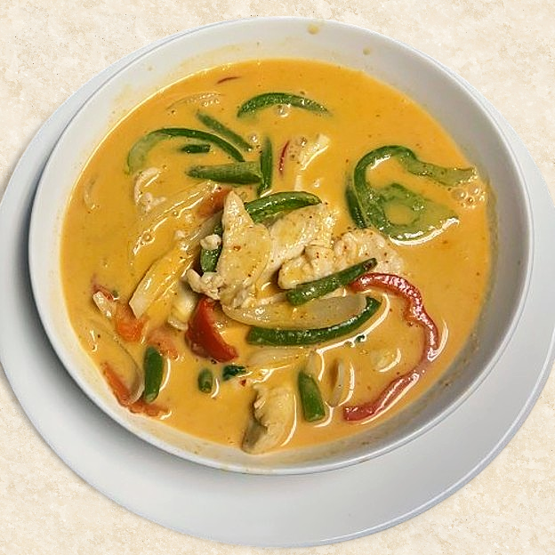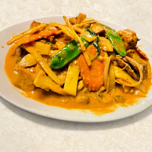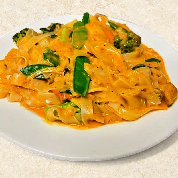 Thai wide rice noodles stir fried with red curry, snow peas, onions, basil, carrts,