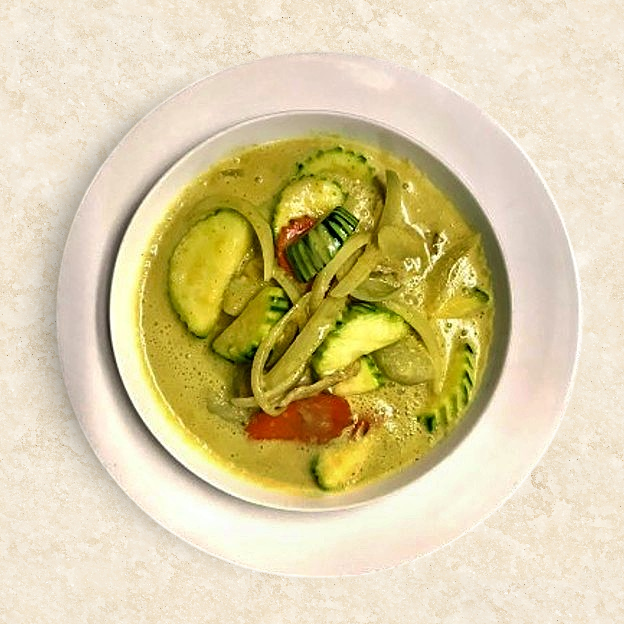 Yellow curry and coconut milk with potatoes, zucchini, onions and carrots.