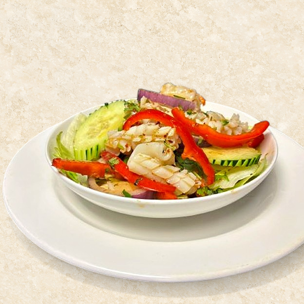 Thinly Sliced Charcoal Grilled Steak Mixed w. Cilantro, Red Onions and Red Bell Peppers served on a bed of lettuce and top w. cucumbers.