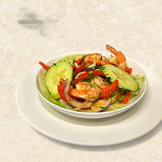 Shrimp, Mixed w, Fresh Cilantro, Red Onions, Lemongrass and Red Bell Peppers topped w. cucumbers.