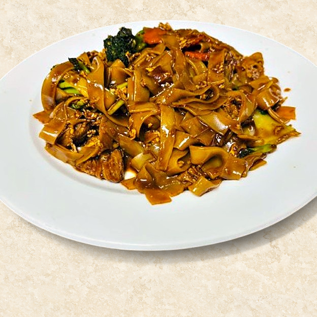 Choice of meat*, Stir-fried rice noodles with broccoli, carrots, garlic, bokchoy, egg and bean sauce.