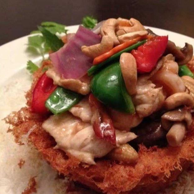 Crispy deep fried dry baby squid dressed in spicy sweet sauce & sesame seeds.