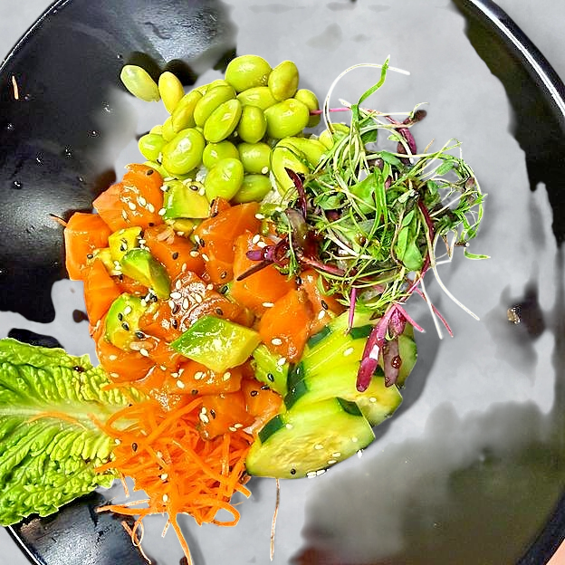 Serves with Carrots Edamame, Avocado, cucumber, choose: 1. Sushi rice or spring mix or both. 2. Salmon or Tuna (Poke sauce), Spicy Salmon or Spicy Tuna (Spicy Mayo)