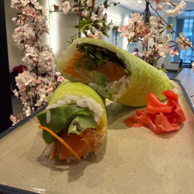 Sushi rice, spring mix, carrots, avocado, cucumber, wrapped with soy paper. With choices of: Salmon or Tuna or Crab or Spicy Crab or Spicy Tuna or Spicy Salmon
