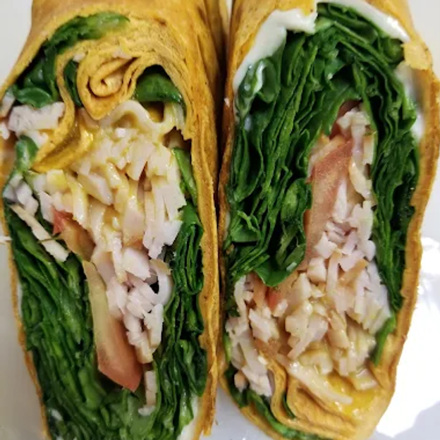 Sliced butterball turkey, Baby Spinach leaves, Provolone cheese, honey mustard dressing on Tomato Basil wrap. Served with a bag of plain Lays or a fresh fruit.