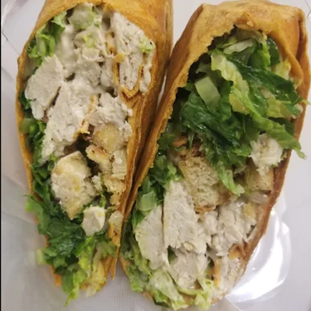 Grilled Chicken Breast, fresh chopped Romaine, grated Parmesan, Croutons and Cesar dressing on tomato basil Wrap. Served with a bag of plain Lays or a fresh fruit.