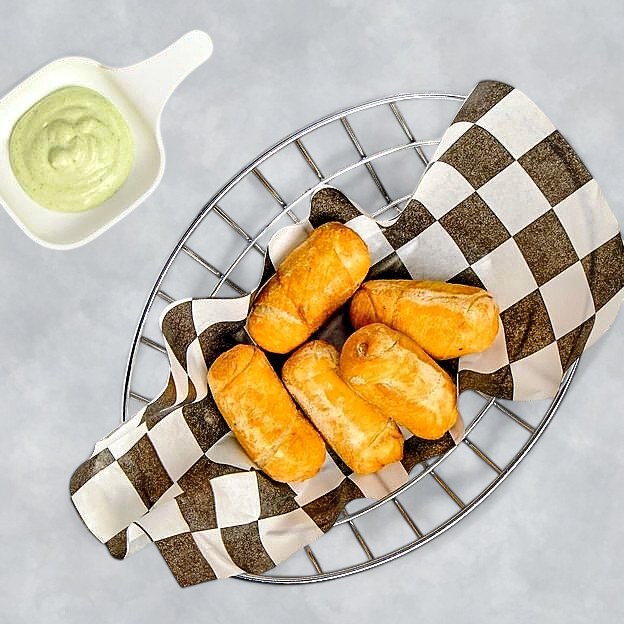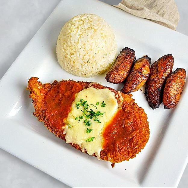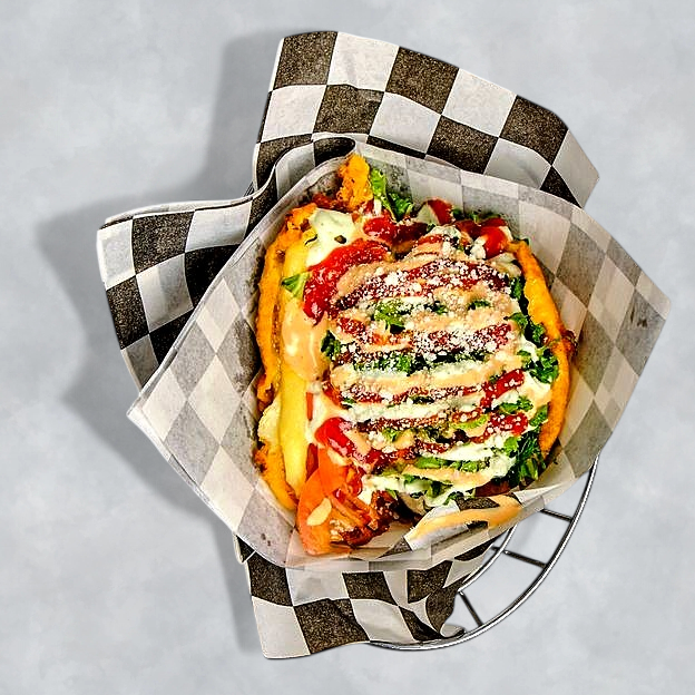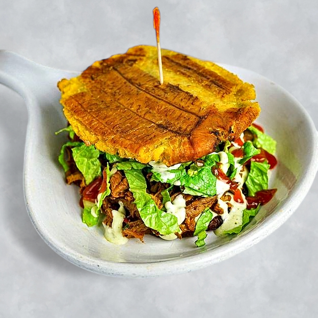 Plátano maduro rebosado en la mezcla de la casa, queso lechuga, tomate, salsa tártara y ketchup. / Battered pantain, cheese, lettuce, tomato, tartar sauce and ketchup.