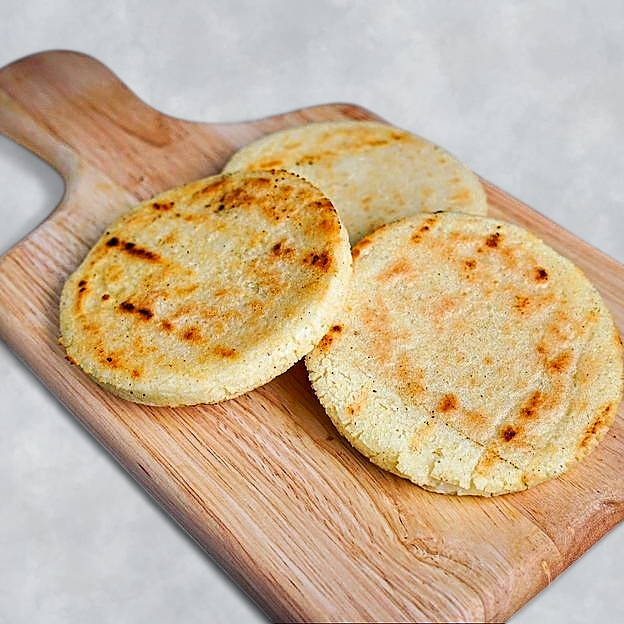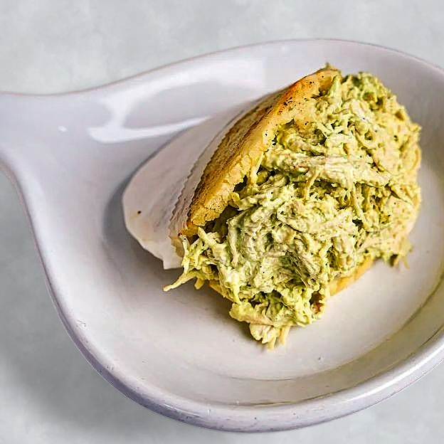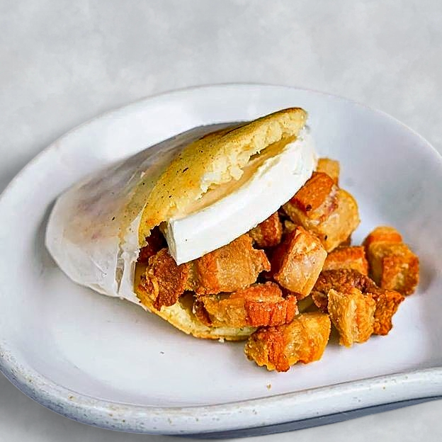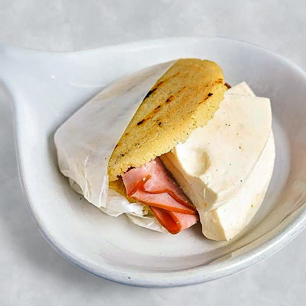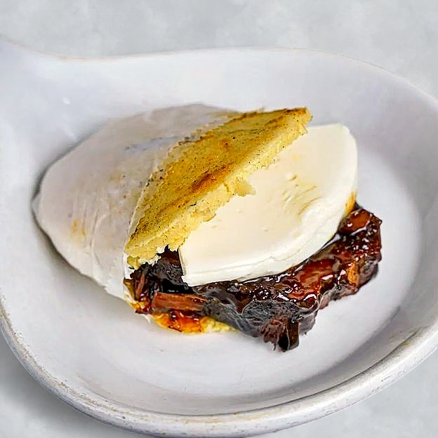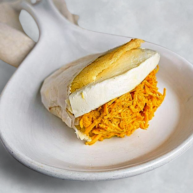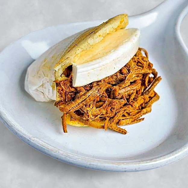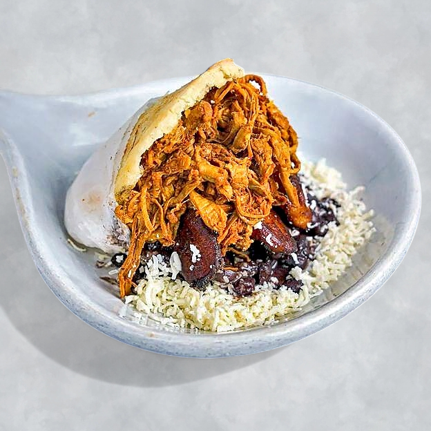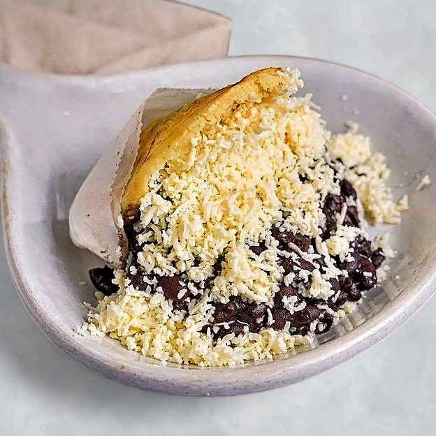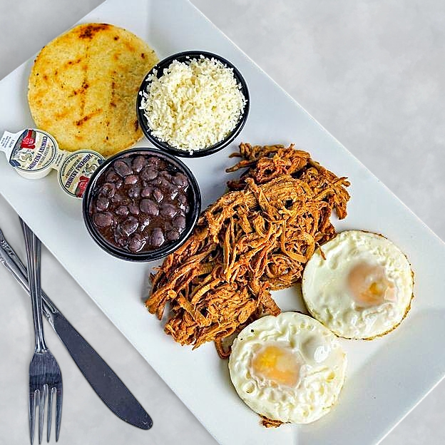 Arepa, carne mechada, queso rallado, huevos (fritos, revueltos o perico) y frijoles. / Arepa, shredded beef, cheese, eggs (scrambled, sunny side or “perico”) and beans.