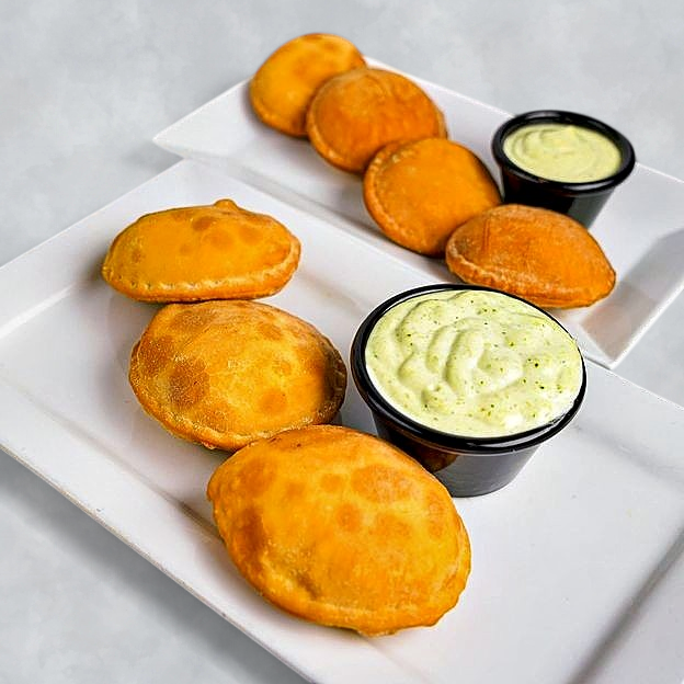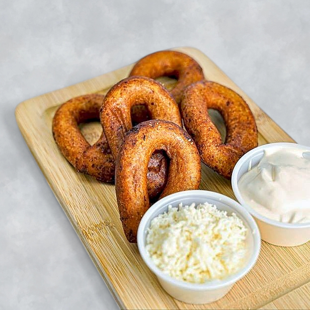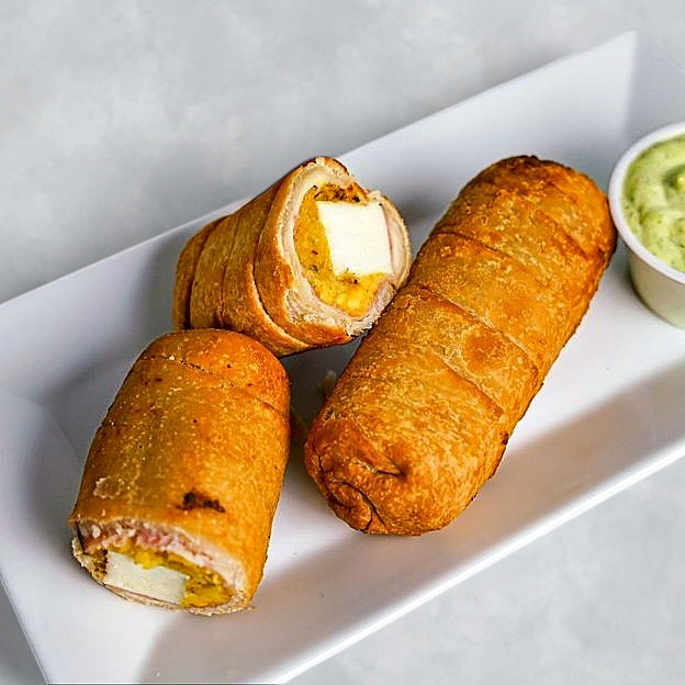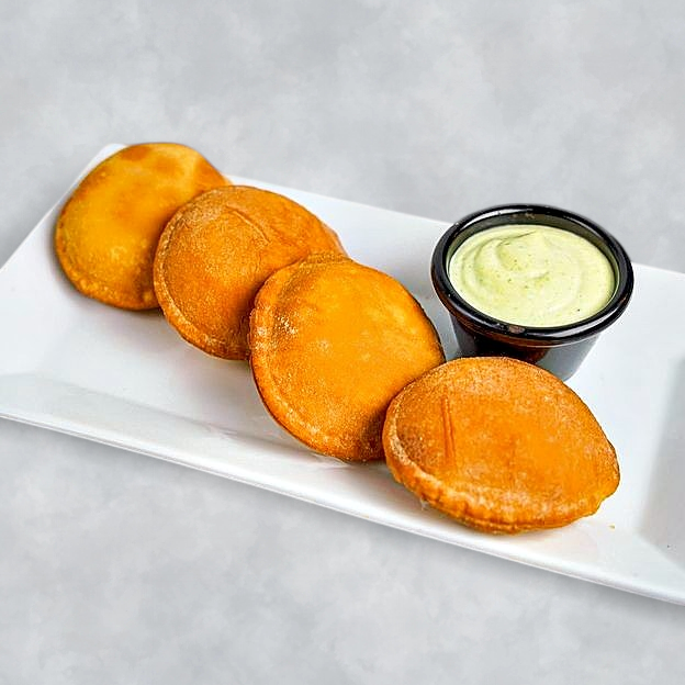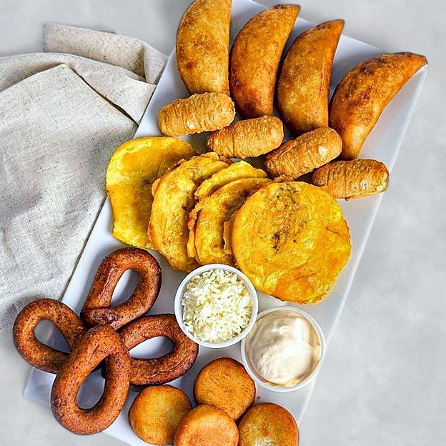 Queso, jamon y platano envuelto en masa frita. /Cheese, ham, and sweet plantain wrapped in a crispy, golden dough.
