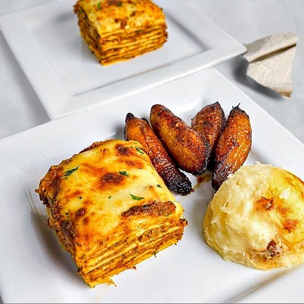Carne mechada, caraotas, queso y platano. / Shredded beef, black beans, cheese and sweet plantain.