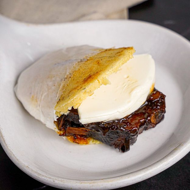 Arepa, carne mechada, queso rallado, huevos (fritos, revueltos o perico) y frijoles. / Arepa, shredded beef, cheese, eggs (scrambled, sunny side or “perico”) and beans.