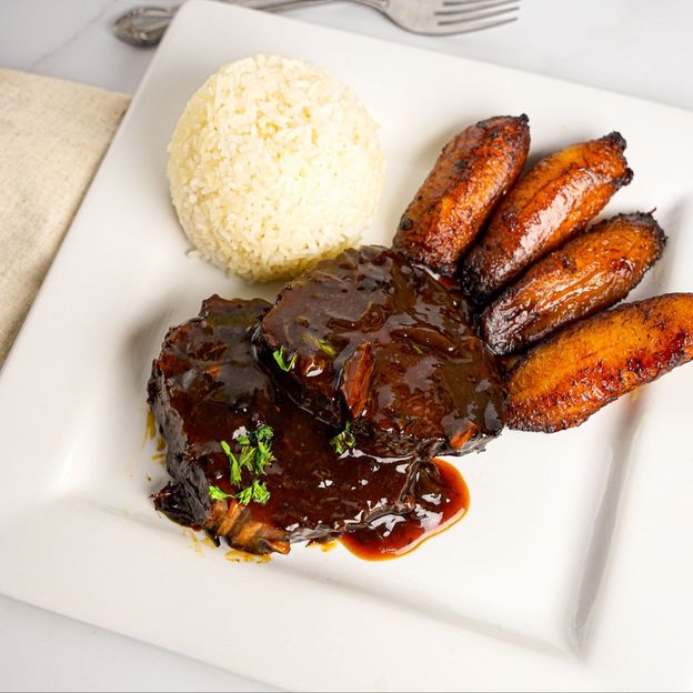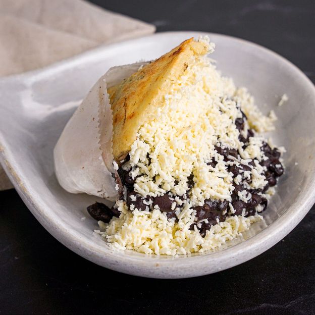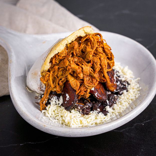 Carne mechada, caraotas, queso y platano. / Shredded beef, black beans, cheese and sweet plantain.
