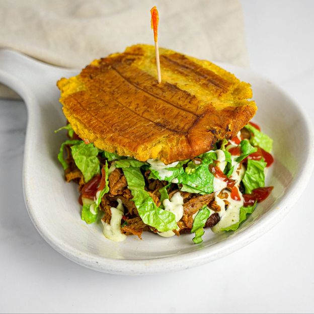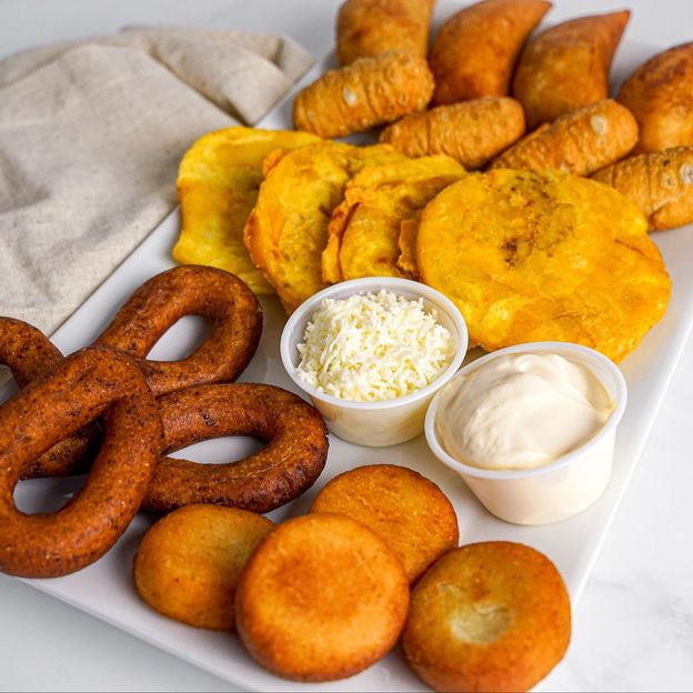 Queso, jamon y platano envuelto en masa frita. / Cheese, ham, and sweet plantain wrapped in a crispy, golden dough.