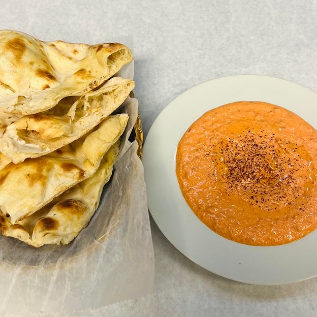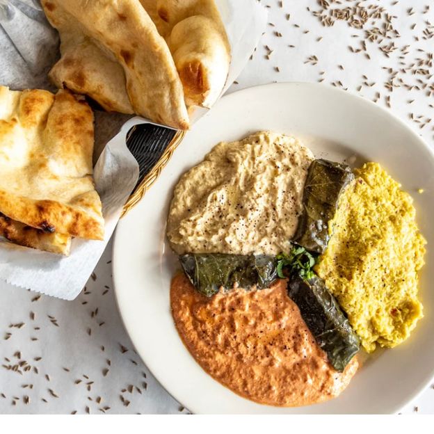 Hummus, mutabel, muhammara and grape leaves served with naan