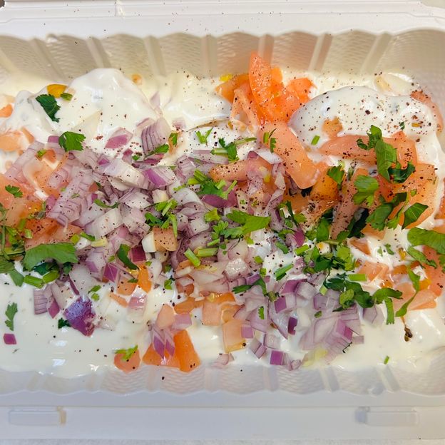 Fried eggplant topped with onions, tomatoes and garlic yogurt sauce