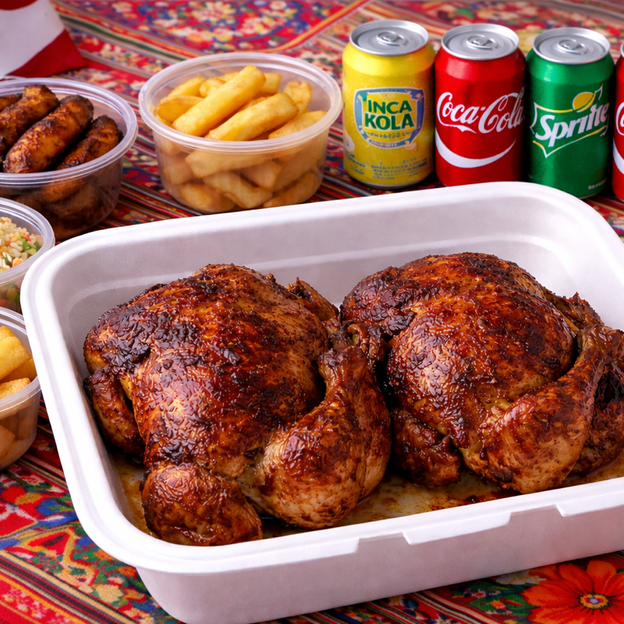 Two whole chickens with four large sides and six cans of soda.