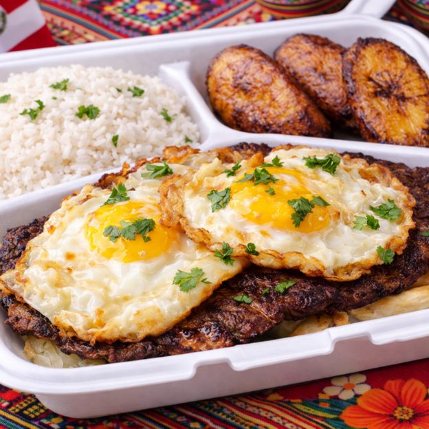 Grilled marinated steak served with two sunny sides up eggs. French fries, rice, and plantain.