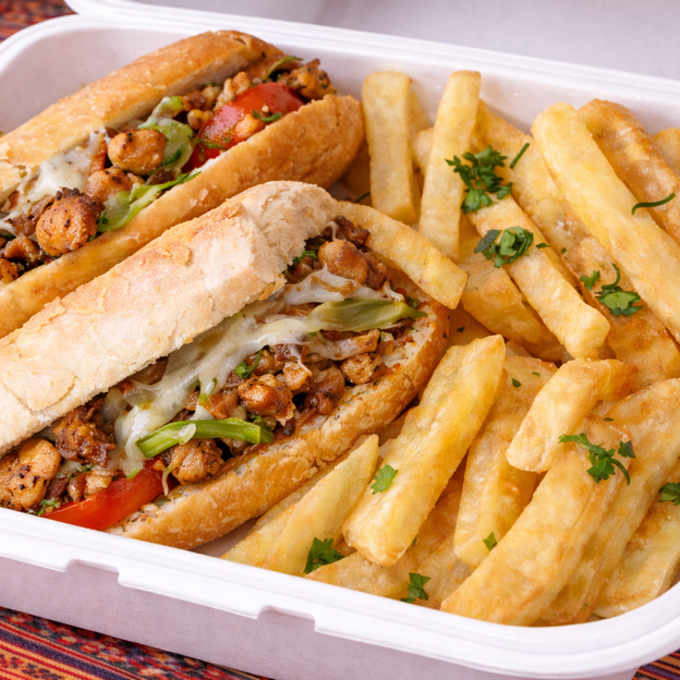 Sub with onions, peppers, choice of meat served with fries.