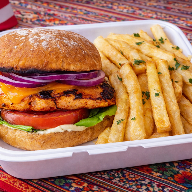 Grilled marinated chicken breast in our special sauces with lettuce, tomato, onion served with fries.