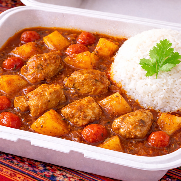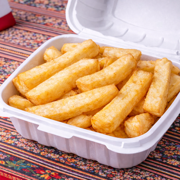 Stir-fried tender strips of sautéed beef, red onion, and spring onions served with rice and fries.
