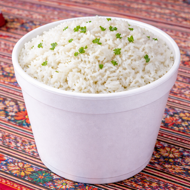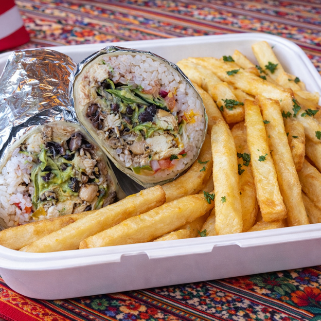 Pieces of rotisserie chicken, tomatoes and onions piled on top of fries. Served with white rice.
