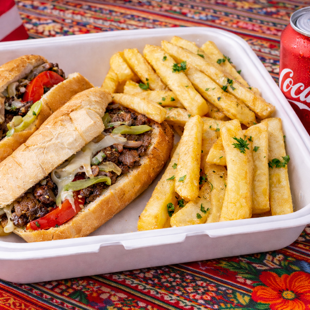 Sub with onions, peppers, choice of meat served with fries and a can of soda