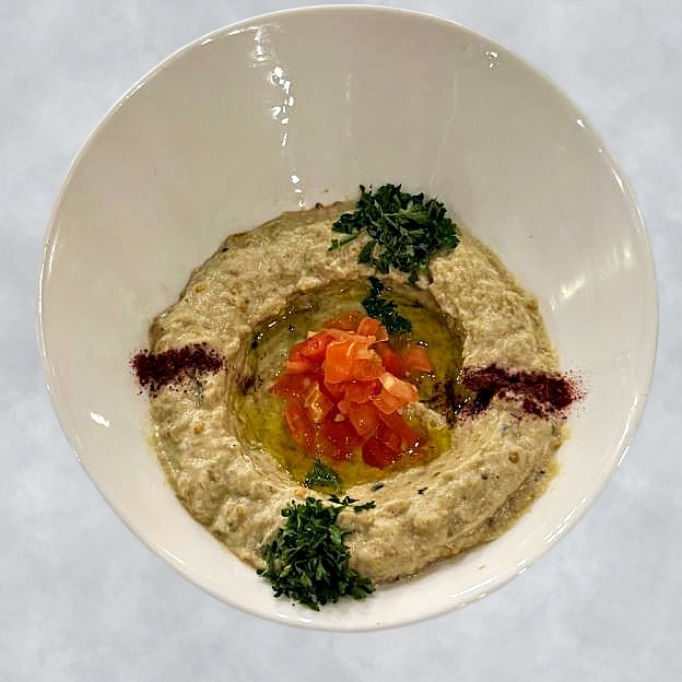 Smoky roasted eggplant blended with tahini, garlic, lemon juice, and olive oil. Served chilled and topped with fresh parsley