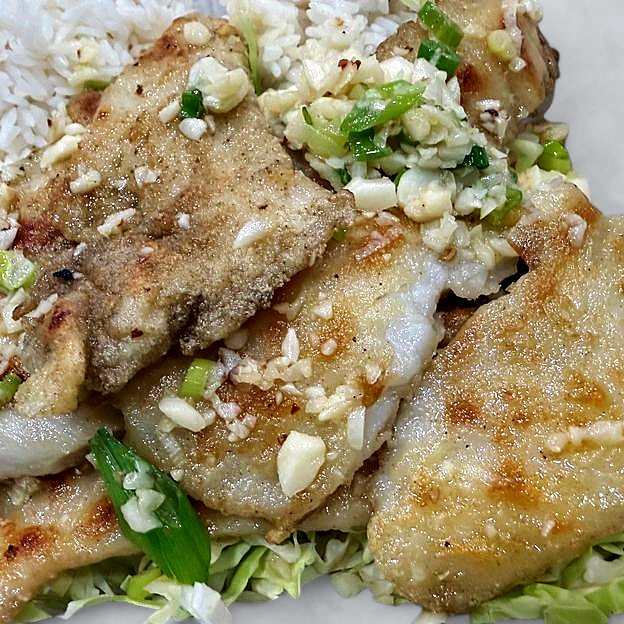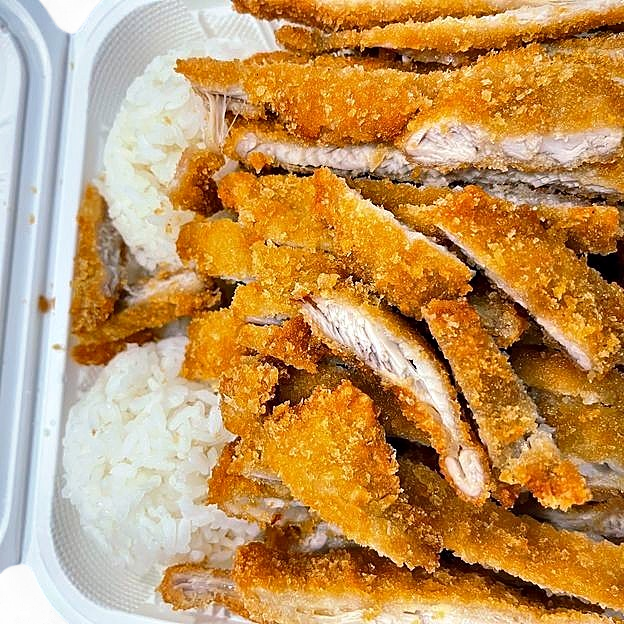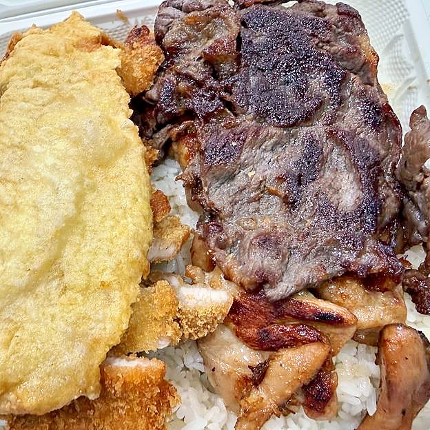 BBQ beef, BBQ chicken, chicken katsu and fried fish.