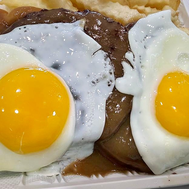 Hamburger patties , covered in brown gravy and topped w/ eggs.