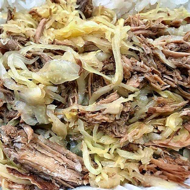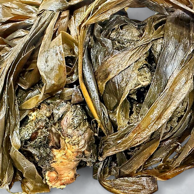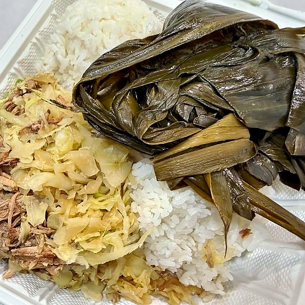 An old Hawaiian tradition. Hefty pork chuck wrapped with taro leaf steamed to perfection paired with smoke roasted pork with ti leaf, banana leaf and sea salt.