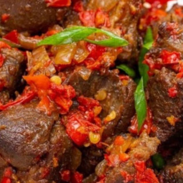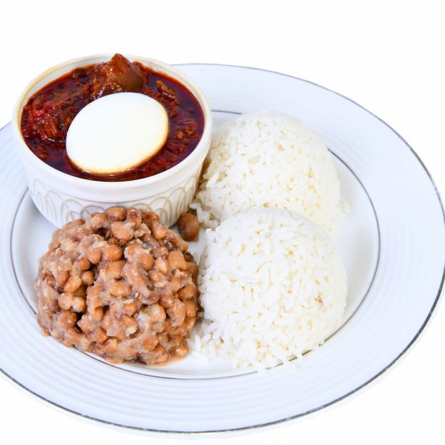 A spicy Palm oil designer stew made with green bell peppers, Scotch bonnet peppers, seasoned ingredents with assorted fried beef cuts and egg. Boiled white rice and beans included.