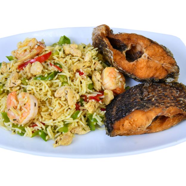 The fish platter comes with a whole grilled tilapia fish, our special Arona sauce. The combo includes fried plantain, jollof rice, soda and coleslaw as side. Select All Items.