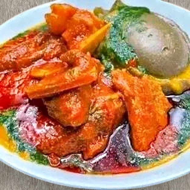 A popular Nigerian vegetable soup from the West. It is cooked with spinach, vegatables, red bell pepper, tomatoes, well cooked in palm oil and seasoned. Swallow is included. Select your choice of protein.