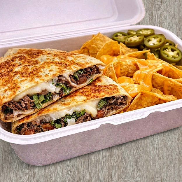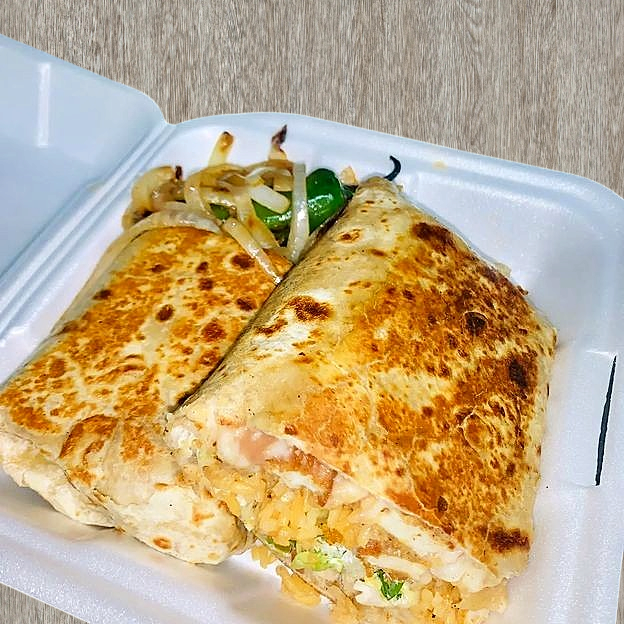 Incluye Frijoles, Queso, Arroz, (Opción de Carne), Lechuga, Tomate, Aguacate, Crema, Includes Beans, Cheese, Rice, (Choice of meat), Lettuce, Tomato, Avocado, Sour Cream.