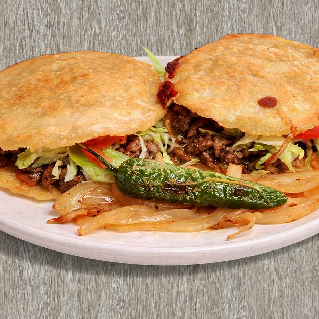 Includes Beans, Cheese, (Choice of meat), Lettuce, Tomato, Avocado, Jalapeño, Cream, Incluye Frijoles, Queso, (Opción de Carne), Lechuga, Tomate, Aguacate,Jalapeño, Crema,