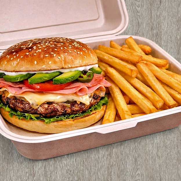 Incluye Carne De Res, Jamón, Queso Blanco, Lechuga, Tomate, Aguacate, Jalapeños, Cebolla Asada, Mayonesa, Ketchup. (Papás a un lado). Includes Burger Patty, Ham, White Cheese, Lettuce, Tomato, Avocado, Jalapeños, Grilled Onions, Mayonnaise, Ketchup. (French Fries on the side).