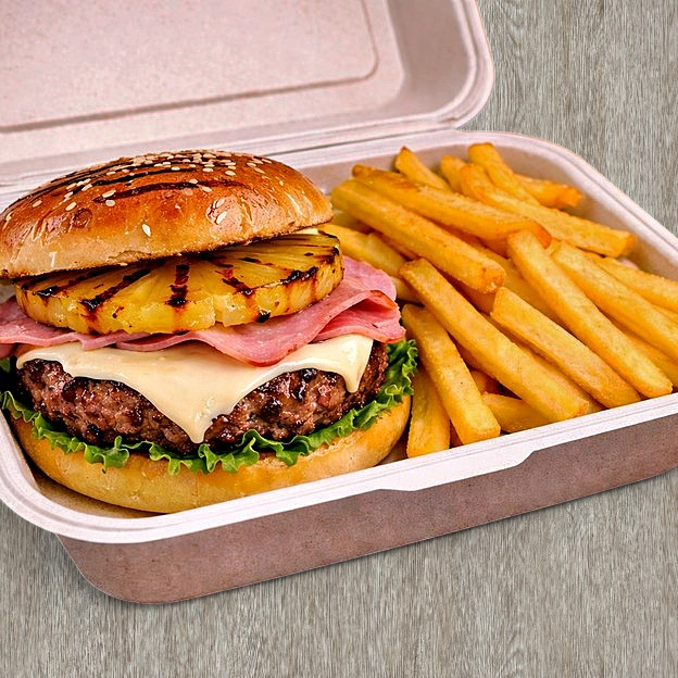 Incluye Carne De Res, Jamón, Piña, Queso Blanco, Lechuga, Tomate, Aguacate, Jalapeños, Cebolla Asada, Mayonesa, Ketchup. (Papás a un lado). Includes Burger Patty, Ham, Pineapple, White Cheese, Lettuce, Tomato, Avocado, Jalapeños, Grilled Onions, Mayonnaise, Ketchup. (French Fries on the side).