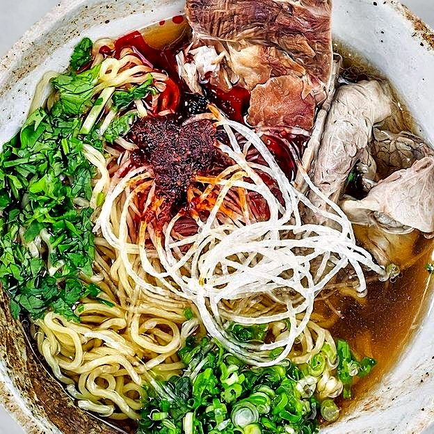 A hearty beef broth wit a shoyu base. Toppings: Daikon radish, scallions cilantro, braised beef brisket, a large beef back rib ( so tender its literally falls right off the bone). A house mild spicy paste & a lime