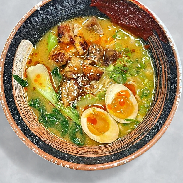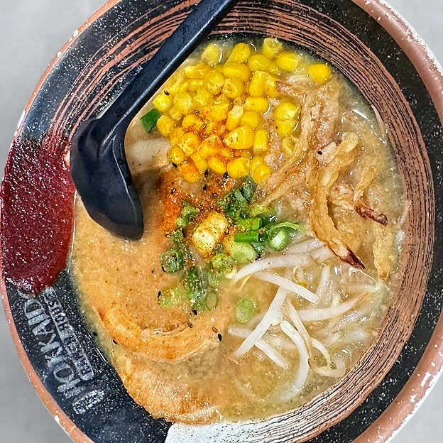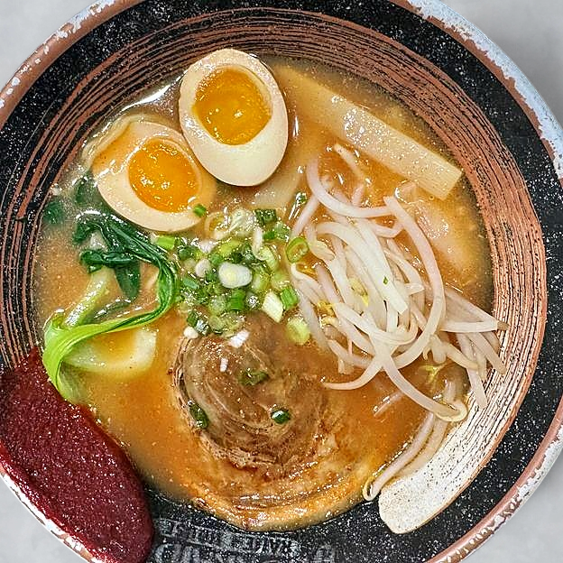 A rich pork & chicken broth with a light garlic & soy bean base.Toppings: A slice of grilled pork chashu, fried onion, sweet corn, bamboo shoots, bean sprouts & scallions, with a smear of spicy chili paste & topped with a spicy miso powder