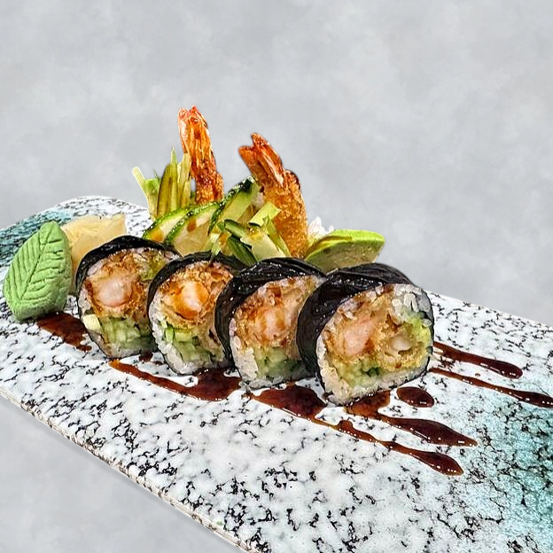 (Oven toasted roll) with shrimp tempura, crab, cream cheese, shredded cheddar cheese & crunch