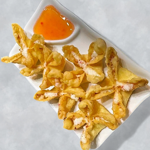 (6)House-made crispy fried wontons stuffed with imitation crab meat, carrots, minced onions & cream cheese, served with a sweet & sour sauce
